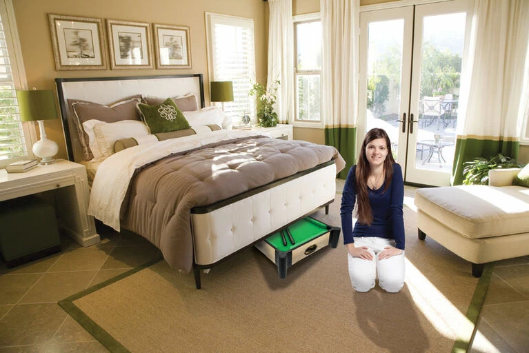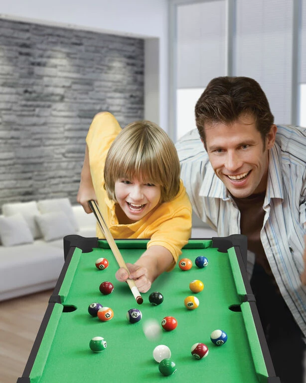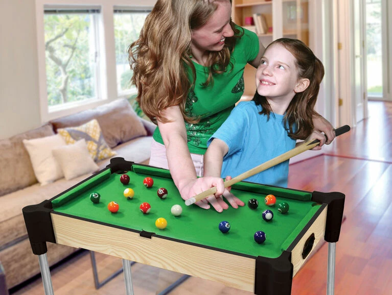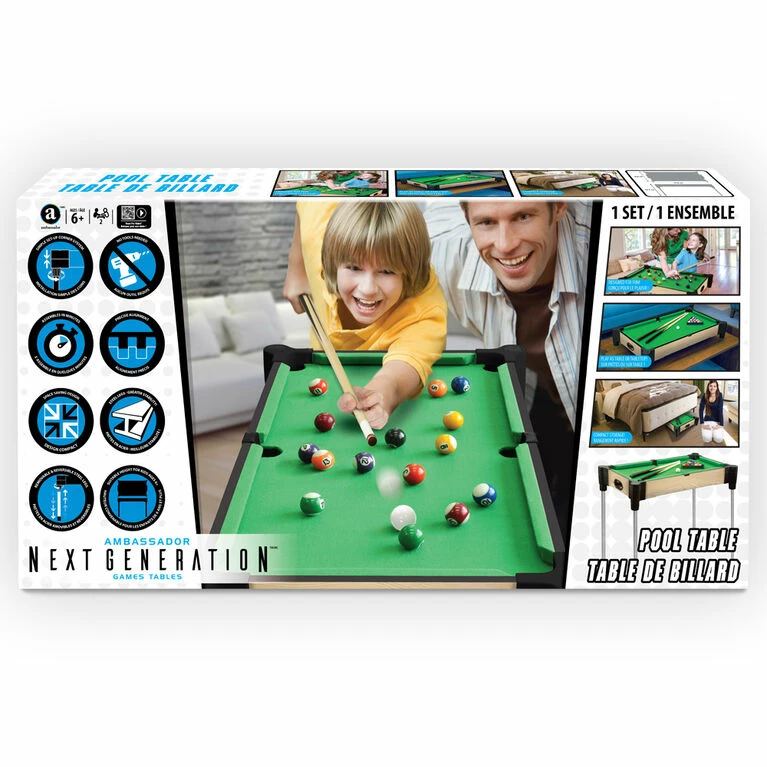 Ambassador Games Tables are the “Next Generation” of games tables. The patented design allows for assembly in minutes instead of hours without the need for any tools, enables both table and tabletop playing modes, is compact for storage, and is more stable and durable than other games tables! This 27″ pool table features professional quality UREA balls, 2 wooden cues, and a triangle. Rack’em up and knock’em down in this fast and fun table that is the ideal height for kids.