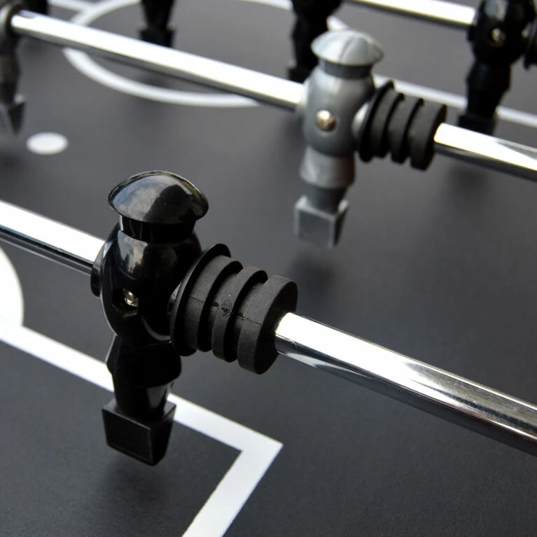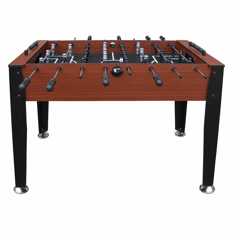 The Dynasty 54 inch Foosball table is guaranteed to bring hours of recreational fun and playful competition right into the comfort of your home. This table is perfect for players of all ages. The cabinet is constructed from durable CARB certified MDF material and supported by 4 sturdy L-shaped legs with 4 inch adjustable leg levelers to keep your table balanced on any surface. Players are made from durable ABS plastic, including a 3-man goalie configuration that heightens the level of competitive table play. Convenient built-in goal boxes help keep the ball in play and the abacus-style slide scorers make keeping score effortless. The attractive dark Cherry exterior cabinet and Black legs combine to create an elegant looking table that plays great. The Dynasty table is an excellent addition to any family game room, garage or man cave. Includes 2 quality foosballs. 180-day limited warranty.
