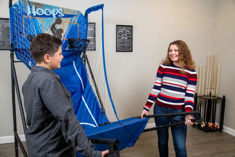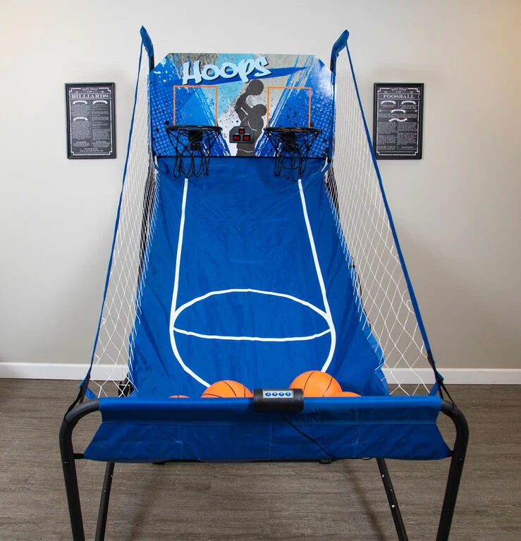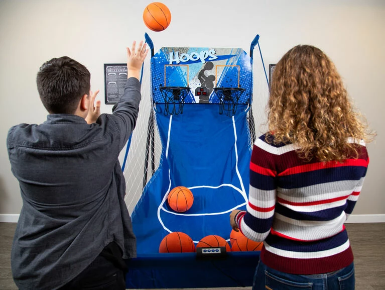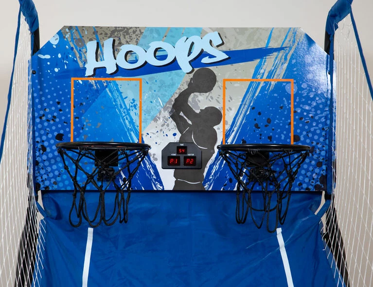 Beat the competition in the comfort of your own home with the quality Hoops Dual Electronic Basketball game. Unlike other basketball games, this game is built to last with a rugged powder coated steel frame and a solid wooden backboard. The infrared electronic scoring above each hoop ensures accuracy while an electronic timer counts down the time. This Hathaway basketball game will provide hours of fun for the whole family. When not in use the unit folds down for easy storage. 180-day limited warranty.
