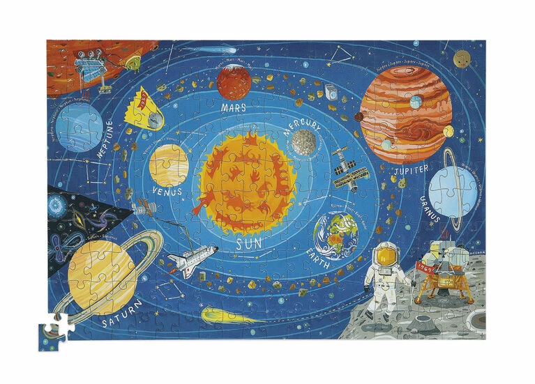 Crocodile Creek’s Space Exploration 200 piece jigsaw puzzle and matching poster will delight all ages. The 13″ x 19″ puzzle has beautiful, colorful artwork that depicts the outerspace, the planets, comets and all other things in the galaxy. The same image is on the poster which makes putting the puzzle together easier. When puzzle is not in use, stores easily in sturdy cardboard cylinder with rope handle. All Crocodile Creek’s puzzles are printed with soy-based ink on recycled cardboard.