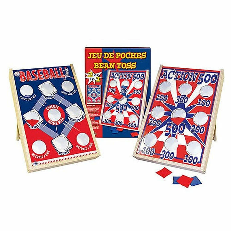 The Action 500 Baseball Bean Toss is a classic game that everyone will love! This Bean Toss game was inspired of a baseball team and it has always been very popular among young boys and girls. Children will love to play with this terrific Bean Toss game. This bean toss game comes with a reversible front. The aim of the game is to score as many points as possible by throwing sand bags into the holes. This game may be played alone or in teams. Comes with 10 sand bags and a reversible front. This game is a must have at home! For for all!
