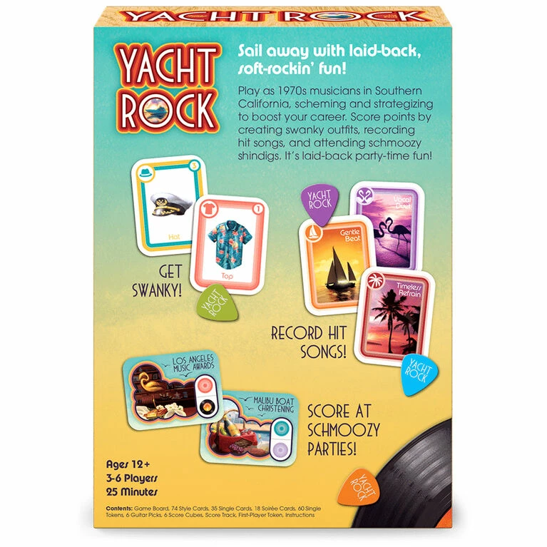 Create the best combination of clothing and music styles to help you score points while also recording singles and attending schmoozy parties to make connections, all set in Southern California in the 70’s. Whoever can score the most points within three rounds is the winner.