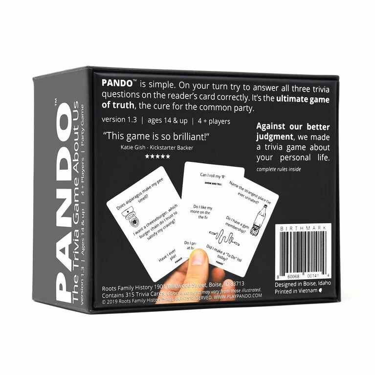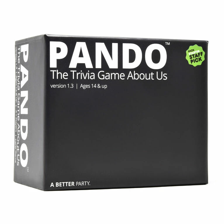 PANDO is a party game for functioning humans. It was made for people who are bored of playing party games where you match up cards and laugh at the result. PANDO is simple. Each round, A guesser attempts to answer all 3 questions on a reader’s PANDO card correctly. Being a trivia buff won’t help you, the questions are about the personal life of the reader. On your turn, attempt to earn a point by answering all three questions on a card correctly. Sound simple? Not so fast Sparky. In other words, PANDO is a test to see how well you know your friends and family. May the odds be ever in your favor.