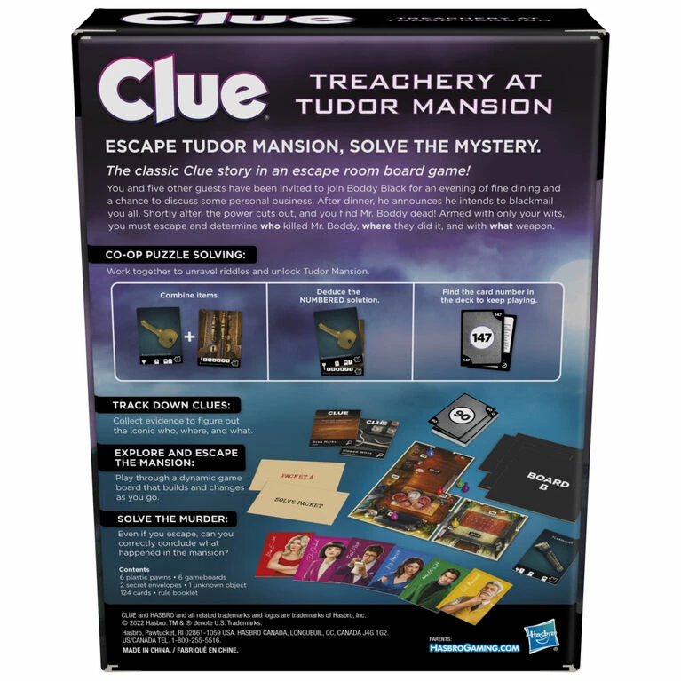 You’re a guest at Mr. Boddy’s mansion when suddenly you hear a shriek, the lights go out, and you find Mr. Boddy dead! You and fellow players are then put to the ultimate test: Work together to escape the mansion, then determine who killed Mr. Boddy, where, and with which weapon. The Clue Treachery at Tudor Mansion Escape & Solve Mystery board game offers classic Clue characters and story in an escape room game that lets players play right away with limited setup. Players move their pawns around a gameboard that’s built room-by-room as they explore the mansion, draw cards, solve puzzles, unlock new rooms, and uncover clues. After escaping the mansion, players review the clues theyโve collected and use deduction to make a correct accusation and win! Gather friends and family together for a game night they won’t forget as they immerse themselves in a cinematic, single-play experience. This escape room game is for 1-6 players, ages 10+, and it makes a great gift for fans of the original Clue game and murder mystery games.