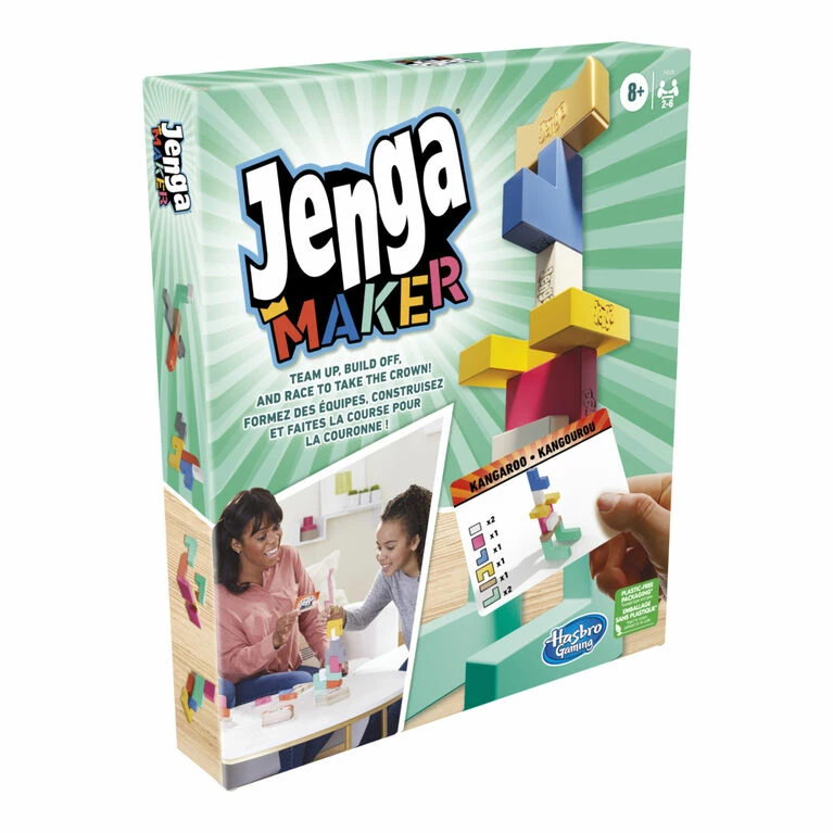 Includes 28 wooden blocks, wooden crown, 200 Jenga Maker cards, and instructions.