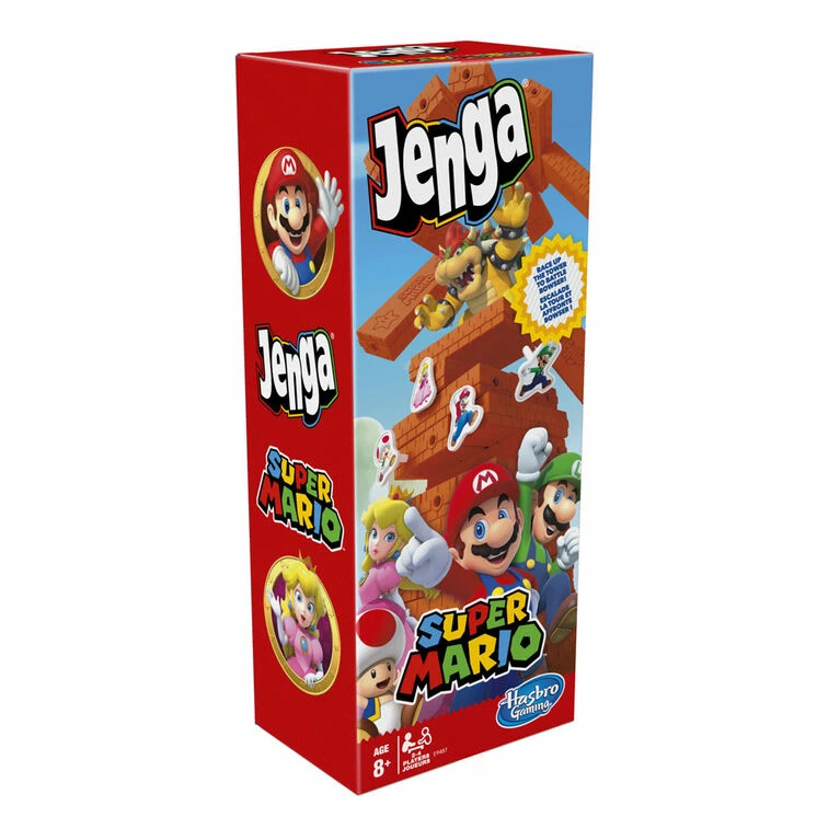 Inspired by the beloved Super Mario video games, the Jenga: Super Mario Edition game has players racing up the tower as Mario, Luigi, Peach, or Toad. Each character gets its own character card to refer to throughout the game. Players earn points by collecting coins as they stack, steal, climb, and defeat Bowser. But watch out…if the tower falls on a player’s turn, they’ll lose coins and it’s game over. Spin the spinner to find out the next move: How many layers to climb, how many blocks to remove and stack, whether to collect coins, or whether the game will reverse directions. It’s a battle to the top as players move their own pegs up and their opponents’ pegs down, all while trying not to make the tower crash. It’s a great gaming experience for fans of Super Mario and Jenga alike!