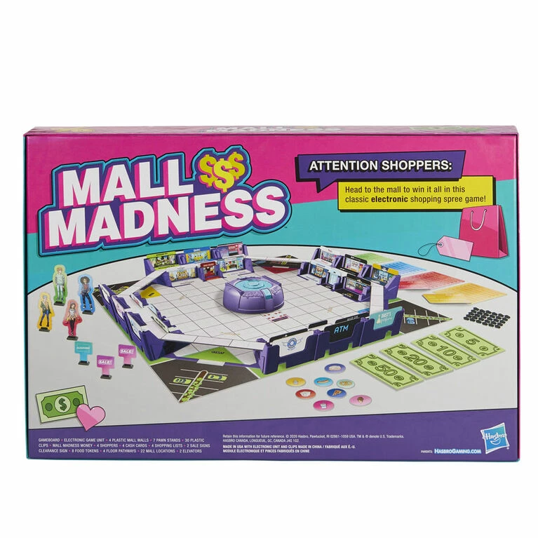 Includes gameboard, electronic console, 4 plastic mall walls, 7 pawn stands, 30 plastic clips, Mall Madness money, 4 shoppers, 4 cash cards, 4 shopping lists, 2 sale signs, clearance sign, 8 food tokens, 4 floor pathways, 22 mall locations, 2 elevators, and game rules.
