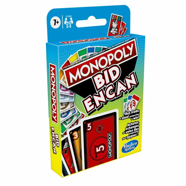 Get ready for an exciting quick-playing Monopoly card game! The Monopoly Bid game is a game of chance, luck, and strategy as players bid in blind auctions, pay with money cards, steal properties with Action cards, and change their luck with Wild cards. Played in rounds, everyone gets a chance to host an auction. When it’s time to bid on a property, players choose how much money they want to risk. Then everyone shouts, “1, 2, 3, Bid!” and lays their money cards down. The player who bid the most money gets that property. Collect 3 property sets to win. The Monopoly Bid game is a great choice for game night, for parties, and as an indoor activity for kids 7 and up