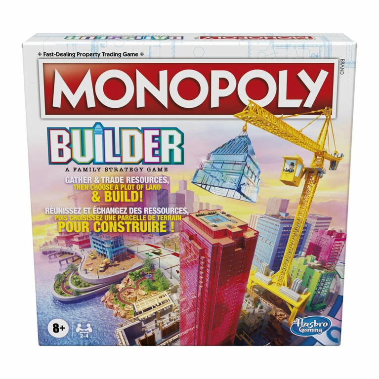 It’s the Monopoly game with a strategy twist on Monopoly Island, located in the center of the board. With the Monopoly Builder strategy game, players travel the board buying properties and collecting rent and resources. They also use builder’s blocks to build their island city! The more a player builds, the more points they’ll earn. The game ends when the penthouse has been built. Then the player with the most points wins! This family board game is designed for 2 to 4 players ages 8 and up — it’s a fun game to play.
