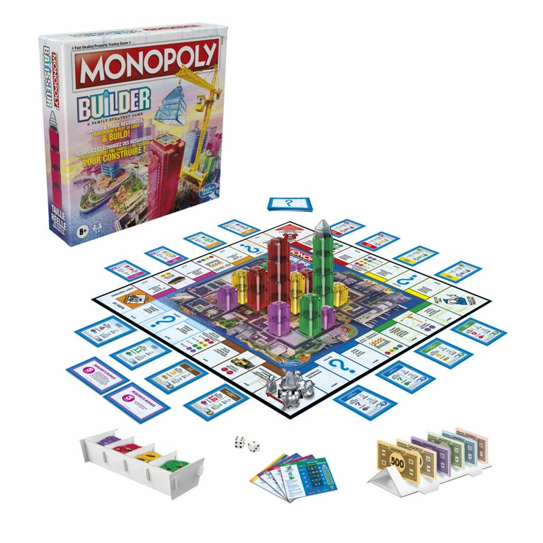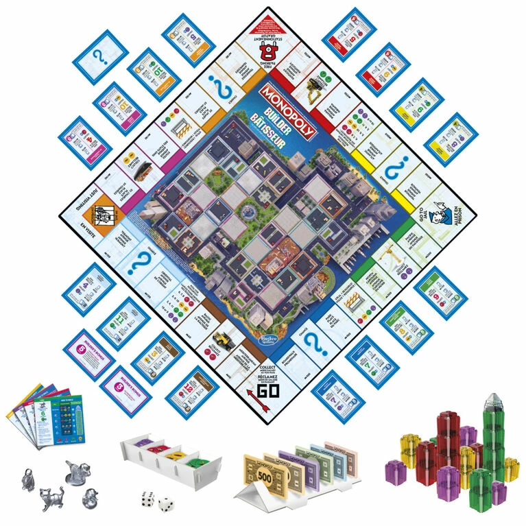Includes gameboard, 4 tokens, 4 reference cards, 16 Title Deed cards, 20 Chance cards, 2 Builder’s Bonus cards, 80 cardboard resource chips, 48 plastic Builder’s blocks, 1 plastic penthouse, 2 dice, money pack, money tray, resource tray, and game guide.