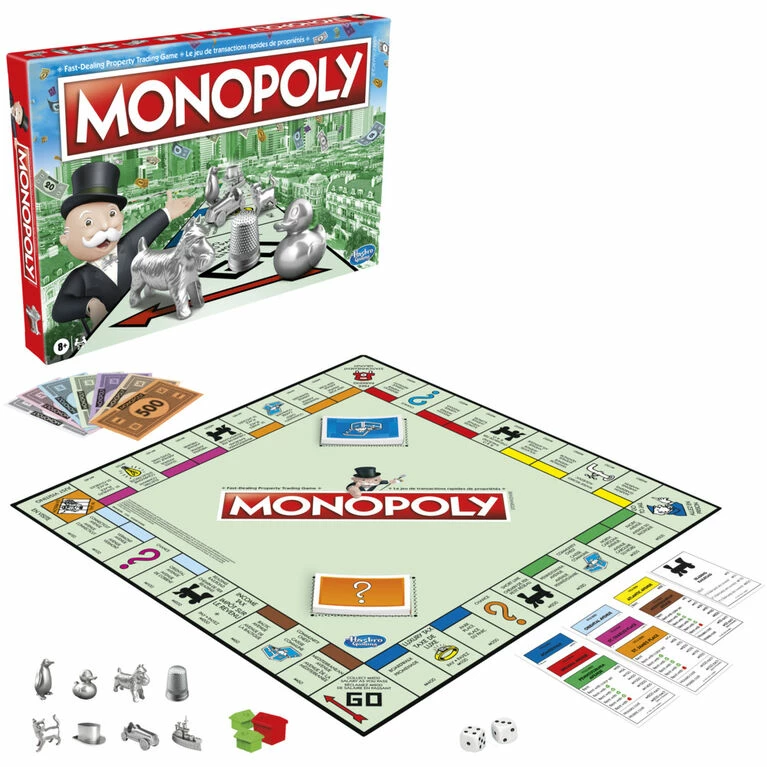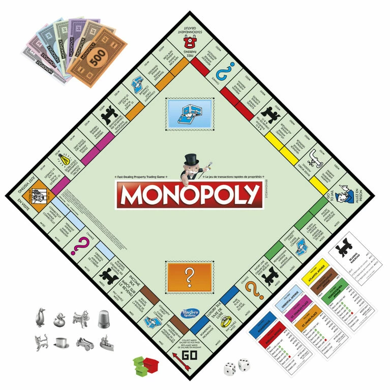 Includes gameboard, 8 Tokens, 28 Title Deed Cards, 16 Chance Cards, 16 Community Chest Cards, 32 Houses, 12 Hotels, 2 Dice, Money Pack and Game Guide.