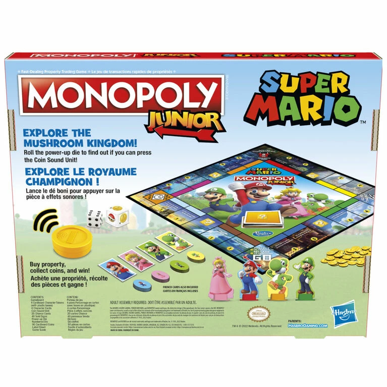 The Monopoly Junior game teams up with Super Mario characters and themes for action-packed excitement! In this Monopoly Junior: Super Mario Edition board game kids can imagine taking a fun adventure through the Mushroom Kingdom. They can choose to play as Mario, Peach, Yoshi, or Luigi, and move around the gameboard buying up properties and collecting coins. Players roll the power-up die to see if they get to press the Coin Sound Unit to hear the iconic coin sound from Super Mario, and to collect coins. This fun game for kids makes a great birthday or holiday gift for Super Mario fans and kids ages 5+.