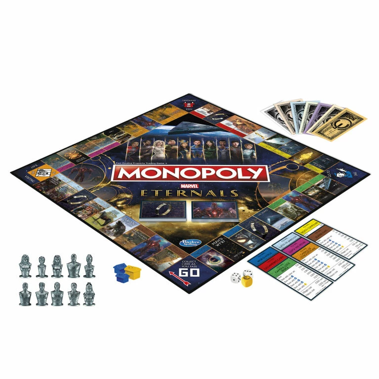 Includes gameboard, 10 tokens, 28 Title Deed cards, 16 Uni-Mind cards, 16 Arishem’s Judgement cards, 10 Character cards, 32 Villages, 12 Palaces, 3 dice (2 white, 1 golden), Money Pack, and game guide.