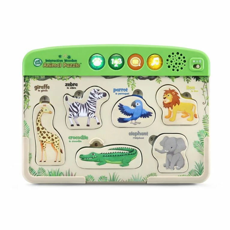 The Interactive Wooden Animal Puzzle is a perfect fit for playtime! With four interactive play modes, this puzzle is full of delightful surprises. Match six animal puzzle pieces by shape and color border. Kids will hear different responses when they place or remove each piece in every mode. Animal names and sounds, colors and fun facts are featured in Animals mode. In Numbers mode, count the objects hidden under the animals. There are three eggs under the blue parrot! Enhance playtime with English mode. Listen to words in English, then hear them repeated in French. Questions about animals, colors and numbers help reinforce the learning. Add musical notes and animal sounds to background beats in Music mode. Hear an animal symphony when you take out all the pieces at once. Go wild for puzzles! This product is made with 100% FSC-certified wood that comes from well-managed forests. The plastic used to make is product is 90% reclaimed. Intended for ages 2+ years. Requires 3 AAA batteries. Batteries included for demo purposes only. New batteries recommended for regular use.