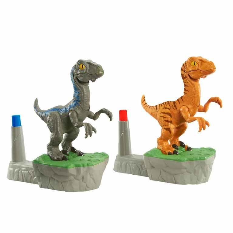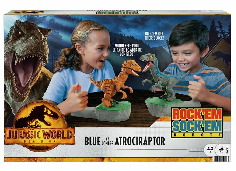 Get ready for the thrills and adventure of Jurassic World Dominion. Mix it up with the boxing robots kids love in a Rock ‘Em Sock ‘Em Robots Blue vs Atrociraptor game that will have fans roaring! Each raptor is attached to a base, one blue, one red, so they can go head-to-head while roaming “wild,” not confined to a ring. Kids press the button at the back of the base to open the raptor’s mouth, then try to get their raptor to clamp down on the other raptor’s head and bite ’em off their block! It’ll be the greatest dinosaur battle of all time! Makes a great gift for kids 6 years and older. Colors and decorations may vary.