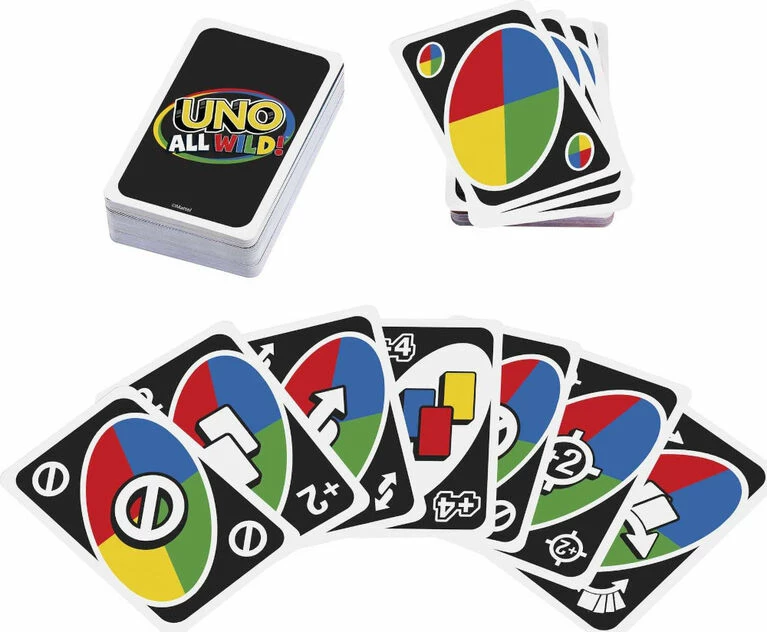 In UNO All Wild card game, every single card is wild for a fast-paced, even more unpredictable version of this family favorite! There’s no matching of number or color like regular UNO, but it’s not as easy as it sounds. Special Action Cards really change the game! There’s a Wild Skip Two card where players skip two other players instead of the traditional one, a Wild Forced Swap card where players change entire hands and more! This edition is as addictive as it is exhilarating and makes a great gift for players 7 years and older. Colors and decorations may vary.
