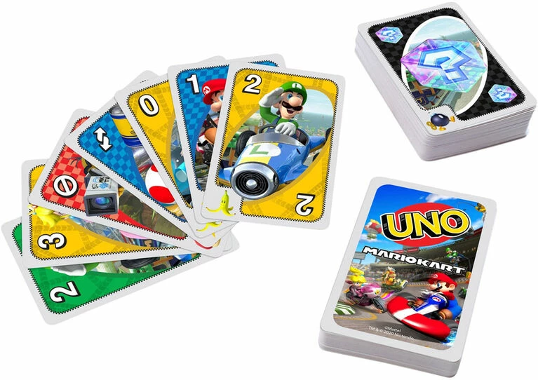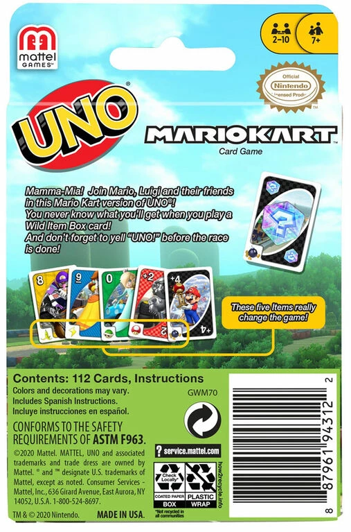 The UNO matching card game everyone loves rides into the Mario Kart world of crazy obstacles and racing go-karts! Graphics from the game on every card make this unique pack a collectible for fans. It plays like classic UNO, except every card has an ITEM icon in the corner (Mushroom, Banana Peel, Green Shell, Lightning, or Bomb). The ITEMS don’t do anything during normal play. But when the wild Item Box Card is played, the player flips over the top card of the Draw Pile and immediately uses the ITEM on that card! Each ITEM has a different action. This pack makes a great gift for players 7 years and older, especially Mario Kart fans. Colors and decorations may vary.