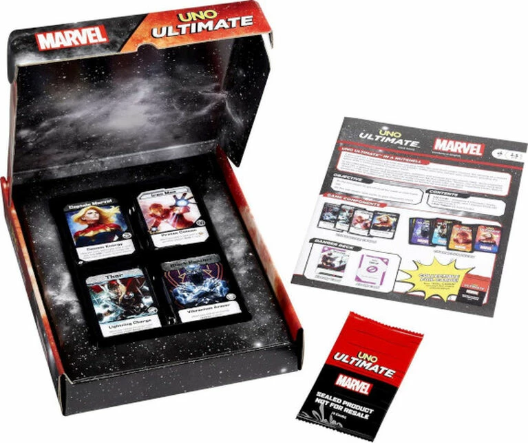 With this UNO Ultimate card game, players may not be Marvel Superheroes, but they can play like they are! This premium version of UNO features four card decks, each designed specifically for a popular, heroic character. Each player chooses to play as a character who has special powers that they can use on EVERY turn. A Danger Deck holds “Event” and “Enemy” cards to switch the balance of power! Players race to get rid of all their cards just like the classic UNO game, and they can’t forget to yell “UNO!” when down to their last one. Unique to UNO Ultimate are TWO ways to win each round as well as four collectible, never-before-seen Foil Cards which players can keep and collect or put in the game itself to spice up the Ultimate deck! The card game makes a great gift for fans of UNO, Marvel and fun on game night. Colors and decorations may vary.