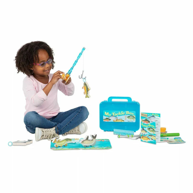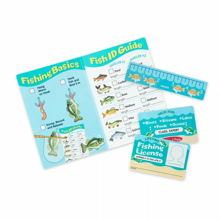 Explore the outdoor experience of fishing with the 21-piece Melissa and Doug Let’s Explore Fishing Play Set! Grab the two wooden fishing rods, bait the hooks with pretend worms, then hook and scoop up the six wooden fish! A reversible play mat lets young anglers choose a winter or summer experience. The illustrated fishing guide helps identify fish types, explains fishing basics, and includes fun games. Everything stores in the tackle box for quick and easy cleanup. Let’s Explore encourages kids three and older to connect with the natural world through imaginative play! Discover the joy of outdoor adventures that instill curiosity and confidence while inspiring kids to say, “Let’s Explore”!