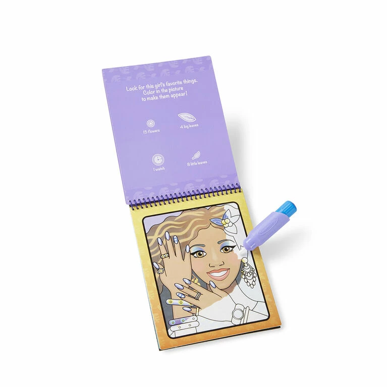 No-mess painting for kids! This exciting paint-with-water coloring book includes four reusable pages and a refillable water pen. Simply fill the pen with water and color in each scene–details and vibrant color appear with every stroke! Then let the pages dry to erase the pictures and fill them out again and again. This makeover-themed book includes four scenes of young ladies with beautiful makeup and accessories to color, plus search-and-find activities for each scene. The chunky-sized water pen is easy for kids to hold and stores neatly right in the front cover, so Water Wow! makes an ideal travel activity book and travel toy.