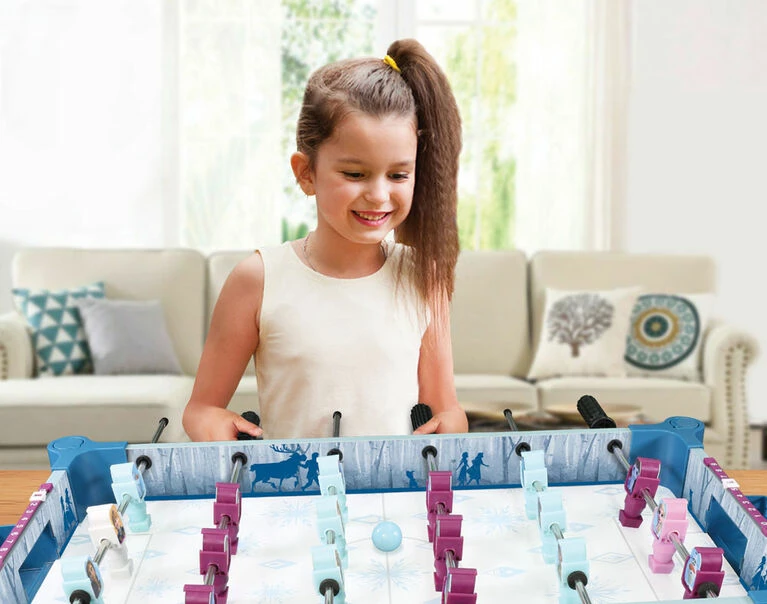Play foosball with your favourite Frozen characters! First choose your team from any of the 18 Frozen characters included, including Elsa, Anna, Kristoff, and Olaf. Set each character in your preferred position, such as goalkeeper or striker. Place the ball into play, and its game on! This set offers all the thrills of a traditional foosball table – including pull shots, rollovers, and pull kicks – and at 27″ long it is small enough to fit on most tables and desks, and is compact for storage. The innovative table design allows you to play both in table or tabletop mode. The durable wood construction ensures it will withstand wear and tear. Includes six steel rods, nine detailed football players per side, a classic slide scorer, and two foosballs. Removable legs also allow for compact storage when the table is not being used. The table also features new safe-lock corner system, allowing quick assembly and avoiding safety hazards as no screws or nails are used!