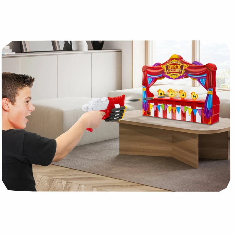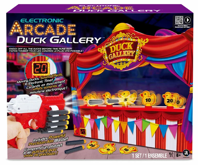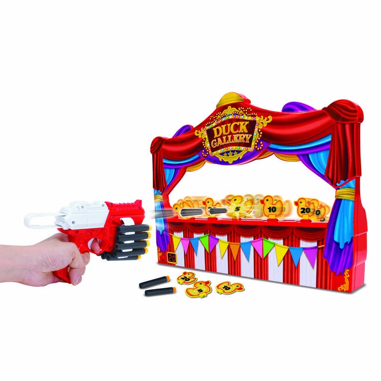 Step right up, step right up! Everyone’s a winner in this fun and exciting version of the classic duck gallery shooting game! Just like the carnival and arcade versions, the objective is to knock over as many ducks as you can in 60 seconds. Each duck rotates around the stage along the moving conveyor belt, increasing the challenge. The ducks also come in 3 sizes each with a different point value, so take careful aim at the smallest ones to increase your score! Carnival music and duck quacking sounds add to the atmosphere, while the bright LED timer lets you know how much time is remaining. Once you’re done collect the ducks and tally up your score. Replace the ducks on the belt and you’re ready to play again – everyone can take turns trying to set a new record! Comes ready to play with a blaster and darts. For 1 or more players. Requires 3 x AA batteries (not included). Recommended for ages 6 and over.