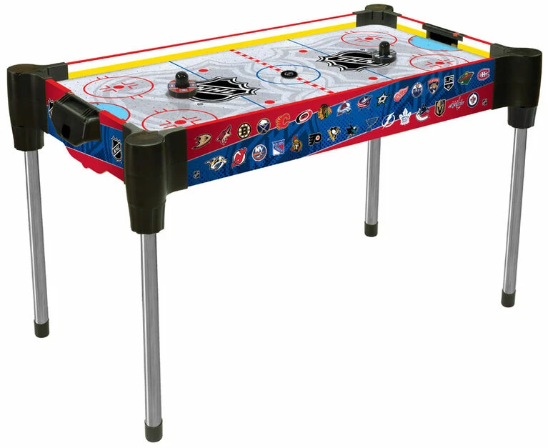 Take air hockey to a new level of excitement playing with your favourite NHL teams! Includes team ringlets that mount overtop your pusher, allowing you to control any of the 31 NHL teams. Take charge of your home team with your opponent as their fiercest rivals and see who comes out on top! The powerful fan provides steady airflow and keeps the puck gliding smoothly. The innovative table design allows you to play both in table or tabletop mode. Removable legs also allow for compact storage when the table is not being used. Assembles in minutes using patented simple-setup games table corner system.