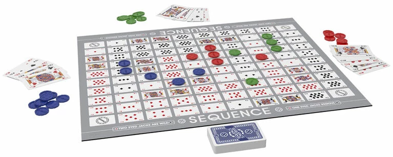 It’s fun, it’s challenging, it’s exciting, it’s Deluxe Sequence in a beautifully crafted tin, and it’s Trilingual! Play a card from your hand, and place a chip on a corresponding space on the game board. When you have five in a row, it’s a Sequence. Learn to block your opponents or remove their chips, and watch out for the Jacks – they’re wild! With a little strategy and luck, you’ll be a winner! The tin easily stores the cushioned playing mat, playing cards, 150 reversible playing chips, and complete instructions. For 2-12 players, ages 7 and up.