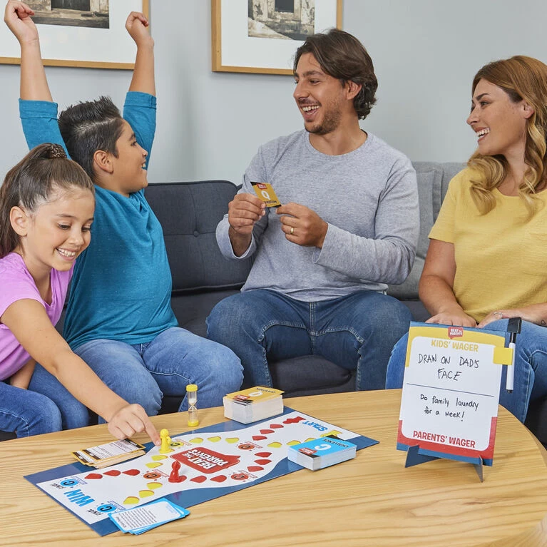 Beat the Parents is the family showdown game where kids compete against their parents for household supremacy! There are more than just bragging rights at stake – each team must pick a wager before the game can begin. What are you willing to do if you lose? Wash the dishes? Treat the other side to movie night? Use the dry erase marker and wager board to put the stakes on display, and then start the competition! Each team reads trivia questions about their generation to the other side, moving their pawn on the board with every successful answer. Reach a Challenge space, and compete team vs team in crazy, up-and-active challenge. Make it to the end of the board first and complete one final challenge to be crowned the winners – and enjoy the wager you’ve just won! This family game night, the stakes have never been higher – or more fun! For 2 to 6 players, ages 8 and up.