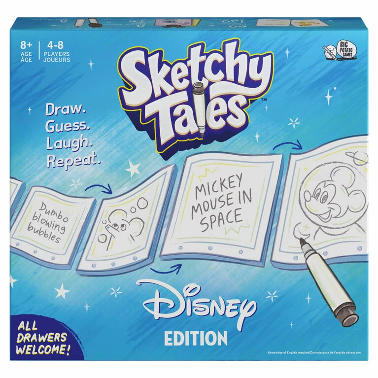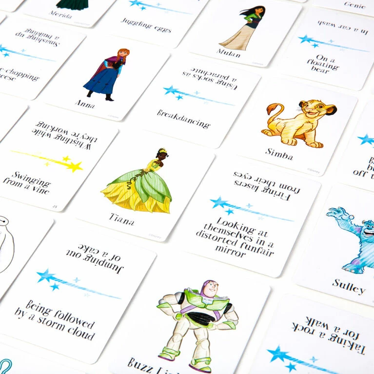 This Disney Game for kids game is all about silly drawings and ridiculous guesses. To start, each player takes a Disney Card and an Action Card. which they keep secret. Decide which character you want to draw and which action you want them to perform. On the blank side of your backboard, sketch your Disney character performing their action. There’s only one rule: no words allowed. Once everyone has finished their masterpieces, they pass them face down to the player on their left. Everyone looks at the new drawing in front of them, takes a blank Sketchy Card and clips it over the illustration. They write down in words what the drawing was about, who was in it and what they were doing. Once you’ve done that, pass the boards to the left again. Read the new description before you all. (Don’t look at the drawing underneath it for help!) Now clip a fresh Sketchy Card over the words and draw what you’ve just read. Then pass it to the left. Continue this sequence of drawing, passing, describing and passing, until your original backboards come back to you. Then Take it in turns to reveal the strange story that your Disney character went on by laying out your Sketchy Cards in order. The owner of this story now picks their favorite drawing or written guess and awards a point to the player responsible. The game ends when a player collects two more points than the number of people playing (or if it hits midnight and you all turn into pumpkins). One of the funnest 2020 new family board games for kids. If you liked Disney Colourbrain, Disney Villains or Disney Codenames you’ll love this.You’ll need between four and eight of your most animated friends to play this game, for ages 8+. Contents include 60 classic disney characters, 120 silly actions, 76 dry erase cards, 8 mini markers and 8 Mickey mouse clips. This disney game for kids will give your family memories to last a lifetime, so come on, be our guest.