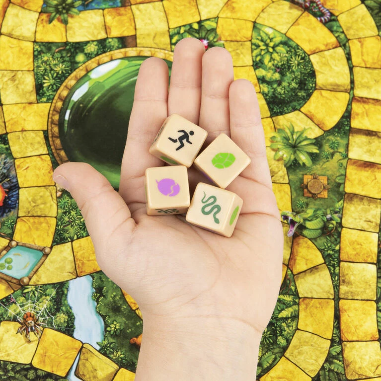 Bring the adventure to life with Jumanji The Game, the latest edition of the legendary board game. You and your band of brave adventurers suddenly find yourselves deep in a mysterious jungle full of secrets and surprises. Danger lies along your path, threatening to take away your 3 precious Life Tokens. Your goal is to reach Jumanji (the center) and call out its name, but beware: if any of your group runs out of Life Tokens, everyone loses! On each turn, roll dice and move along the path, using the Green Dome to reveal a riddle. Solve the riddle correctly and move an extra space. End your turn by drawing a Challenge card to see what difficulties Jumanji has in store for you. You might have to act out a story of your adventures, or race to solve a challenge. Be careful or you may lose a Life Token! Reach the center with at least one Life Token left per player and yell “JUMANJI!” – you’ve just won for the whole group! Jumanji The Game is the exciting adventure game to play with friends and family on your next game night. For 2 to 4 players, ages 8 and up